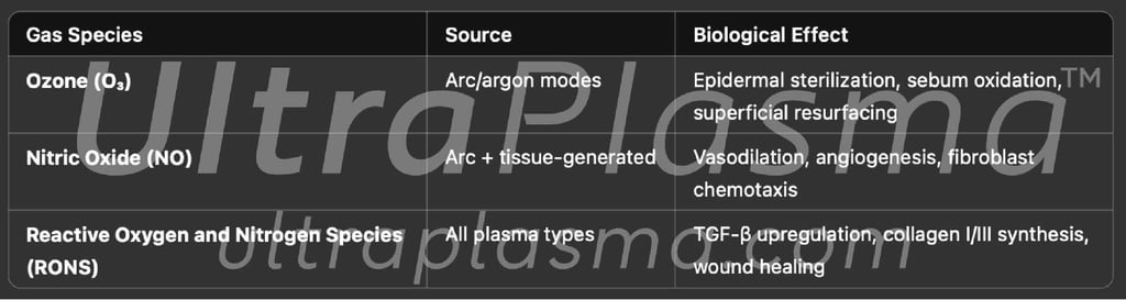 Plasma treatment not only delivers controlled thermal or electromagnetic energy but also acts as a source of biologically active gases that interact with cells, extracellular matrix (ECM), and vasculature. UltraPlasma™ technology is particularly effective due to its engineered capability to regulate these plasma-generated gases for therapeutic effects at multiple skin depths. This section outlines the key gas species involved and their specific bioactivity in skin tightening, tissue regeneration, and lifting applications.