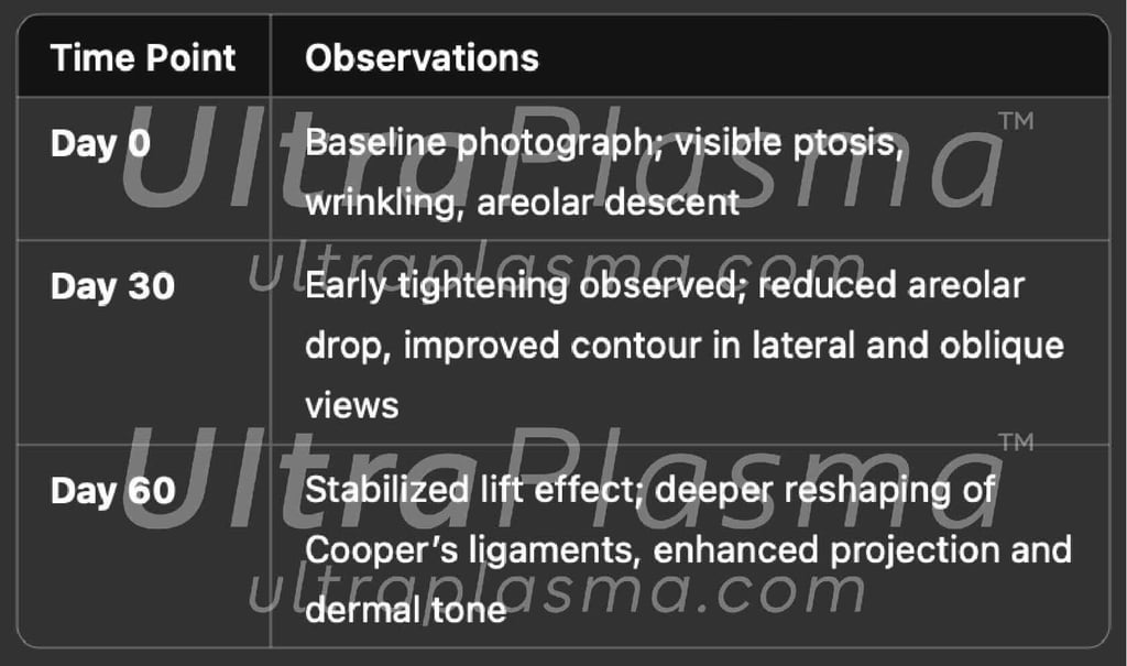 The clinical utility of UltraPlasma™ for breast contouring, lifting, and post-surgical reconstruction has been validated through a growing body of in-practice evidence, supported by objective measurements, subjective assessments, and serial photographic documentation. This section presents an integrated framework for evaluating clinical outcomes across different treatment indications.