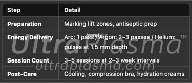Breast aesthetic and reconstructive procedures—especially those focused on volume restoration, contouring, and lifting—have traditionally relied on surgical interventions. However, non-invasive or minimally invasive approaches are gaining traction due to reduced morbidity, faster recovery, and improved tissue quality. UltraPlasma™, a multi-platform plasma technology integrating arc, argon, and helium plasma systems, enables layered, gas-mediated bioactivation of skin and subcutaneous tissues.
