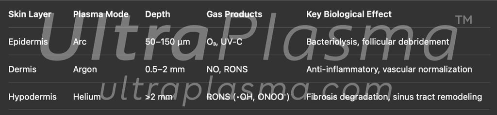 The UltraPlasma™ approach is fundamentally distinct in its ability to selectively target skin layers—epidermis, dermis, and hypodermis—through different plasma types (arc, argon, and helium) while delivering biochemically active gases such as ozone (O₃), nitric oxide (NO), and reactive oxygen/nitrogen species (RONS). This cross-sectional and gas-mediated specificity allows UltraPlasma™ not only to eliminate surface pathogens and biofilms but also to modulate inflammation, restore vascular function, and remodel subdermal fibrotic tissues that are hallmarks of advanced HS.
